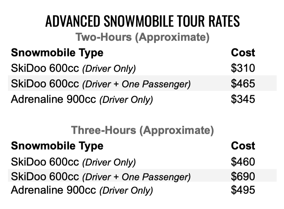 All of our tours are “dry” because it’s illegal and unsafe to operate a snowmobile under the influence of drugs or alcohol.